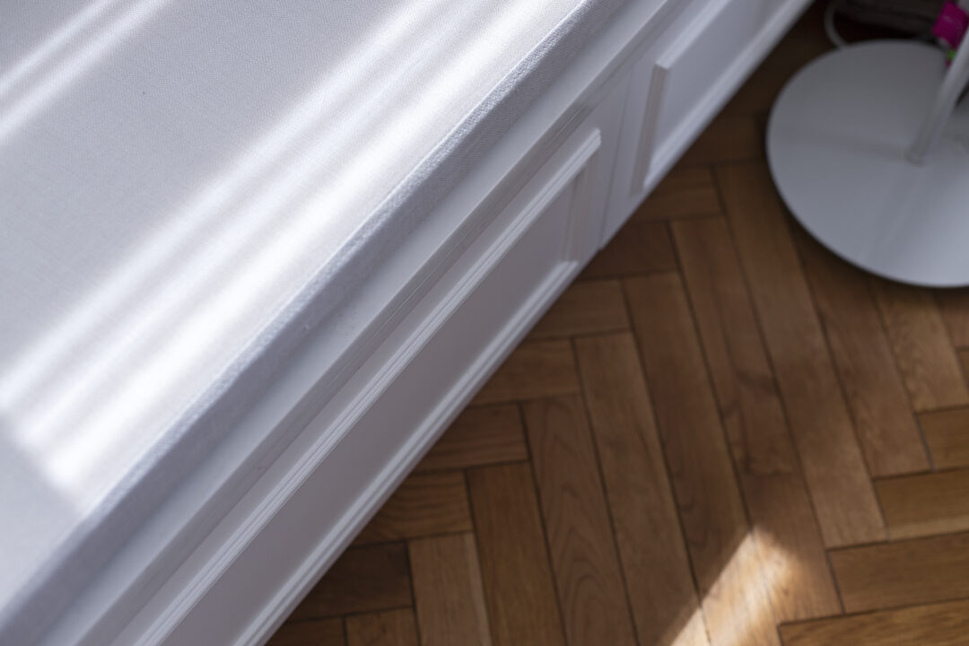 モールディングのウィンドウソファをはじめ、オーダーメイドのカウンターキッチン、リビングのテレビボード、ワークスペースのデスクと夢は広がり、結果的にフルリノベーションすることに。もともと使い勝手のよい間取りだったため、壁の撤去や新設という大掛かりな工事はなく、空間を好みのスタイルに仕上げていきました。
